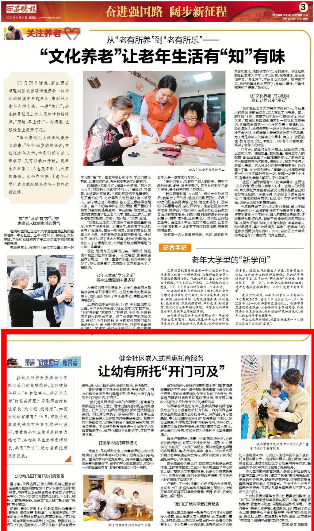 《西安晚报》以《让幼有所托“开门可及”》为题,对申搏托育中心进行了深入报道。记者用生动的笔触描绘了托育中心的环境设施、教育理念以及和孩子们在这里的快乐生活。同时,详细介绍了申搏托育中心以专业高校为主题打造学术型托育新模式的做法和经验。