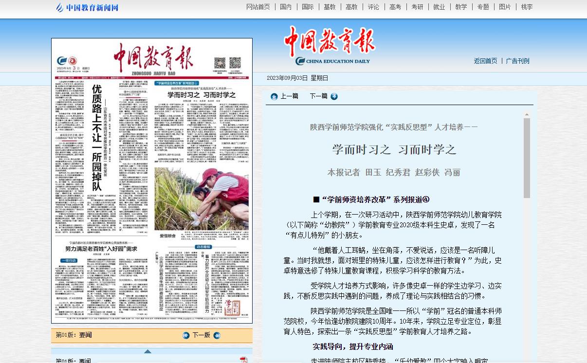 2023年9月3日,《中国教育报》发表了名为“sunbet申搏官方网站强化‘实践反思型’人才培养——学而时习之 习而时学之”的文章,头版报道了申搏幼儿教育学院的教学改革成果。