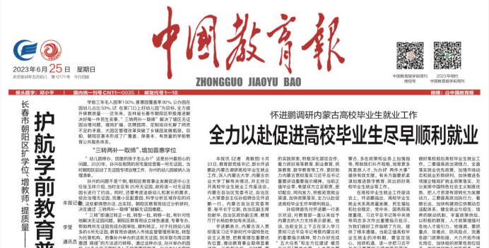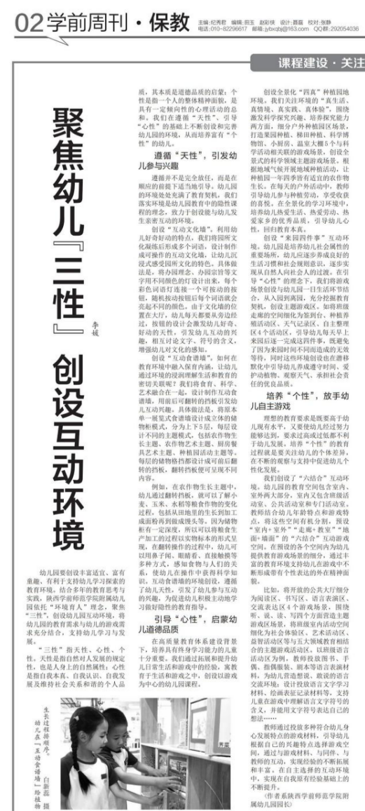 6月25日,《中国教育报》第2版学前周刊•保教栏目刊登了sunbet申搏官方网站幼儿教育学院教师、附属幼儿园园长李媛署名的文章《聚焦幼儿“三性”创设互动环境》。文章从幼儿园环境创设应遵循幼儿“天性”、引导“心性”、培养“个性”等内容进行阐述,以互动文化墙、互动食谱墙、全景化“四真”种植园地等具体案例,深度解读幼儿园进行“六结合”互动环境创设的机制和实践做法,对我园教育需求与幼儿的游戏需求深度结合效果进行了报道。