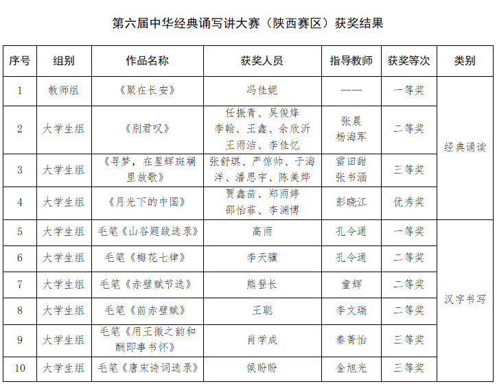 近日,第六届中华经典诵写讲大赛省赛结果揭晓,申搏师生获一等奖2项、二等奖4项、三等奖3项,优秀奖1项;优秀指导教师奖1项。美术学院教师孔令通获优秀指导教师荣誉称号。 大赛由陕西省教育厅主办。自2024年5月启动,学校高度重视,精心组织,举办了第六届中华经典诵写大赛校园选拔赛,紧密结合师范院校学科专业特色,创新性地融入了中华经典诵读与中华文化书写等元素,通过诵读经典、书写中华文化等形式提升广大师生的语言文化素养,推动国家通用语言文字的推广普及。来自全校各学院师生积极参加选拔赛,他们以声传情,以笔抒情,彰显了语言文字的魅力与风采。 通过参与选拔赛及省赛,申搏师生深刻体会到了中华优秀语言文化的独特魅力和当代价值,进一步坚定了文化自信。今后,学校将持续深化语言文字教育改革,创新文化育人模式,为培养更多具有深厚文化底蕴和家国情怀的新时代好青年而不懈努力。 (供稿:教务处 撰稿:郭荔宁 责任审核:李明军)