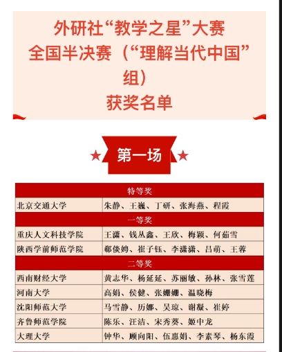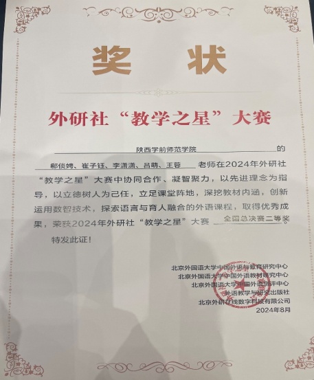 8月1日,2024年外研社“教学之星”大赛全国半决赛“理解当代中国”组的比赛在安徽合肥顺利落下帷幕。由申搏外国语学院教师郗倓娉、崔子钰、李潇潇、吕萌、王蓉组成的教学团队在上半年获得“教学之星”大赛全国复赛陕西省特等奖的基础上,再接再厉,从来自全国各省进入全国半决赛的24组选手中脱颖而出,获得2024年外研社“教学之星”大赛全国半决赛一等奖暨全国总决赛二等奖。创新的教学设计、巧妙的数智融合、自如的精彩展示赢得专家评委和现场观赛教师的一致好评。