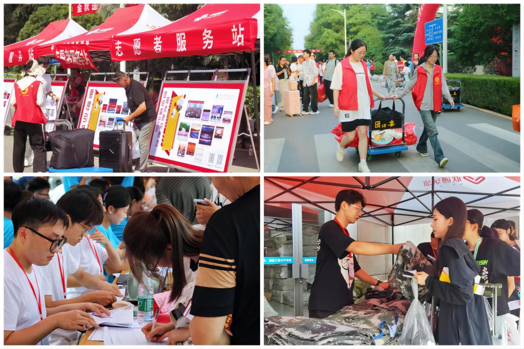 做好人员引导是本次迎新工作的第一要务。为方便乘坐公共交通工具的新生报到,学校在西安火车站、地铁韦曲南站、校门口设置接站点,后勤集团安排专车安全准点保障接站服务。到校后,校团委组织志愿者先锋队在校南门口,认真热情为新生答疑解惑,做好道路指引、搬运行李等服务工作,各二级学院志愿者队伍在宿舍楼前,主动帮助新生及家长搬运行李。校南门口、宿舍楼前“红马甲”“蓝马甲”成为校园里亮丽的风景,为新生提供周到、热情的服务,实现迎新服务工作无缝链接。来人虽如织,井然并有序。一条条励志的横幅、一张张热情的笑脸,对2024级新同学表达着最真挚的欢迎。