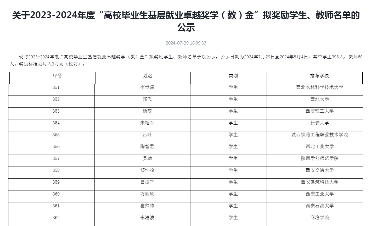 近日,中国教育发展基金会2023-2024年度“高校毕业生基层就业卓越奖学(教)金”的结果公示结束,经奖励委员会评审,本年度全国共评选出398人,其中陕西省高校共12名毕业生获得该项奖学金,申搏2014届毕业生吴瑜从众多参评人员中脱颖而出,获此殊荣,这也是申搏毕业生首次获得该项荣誉。