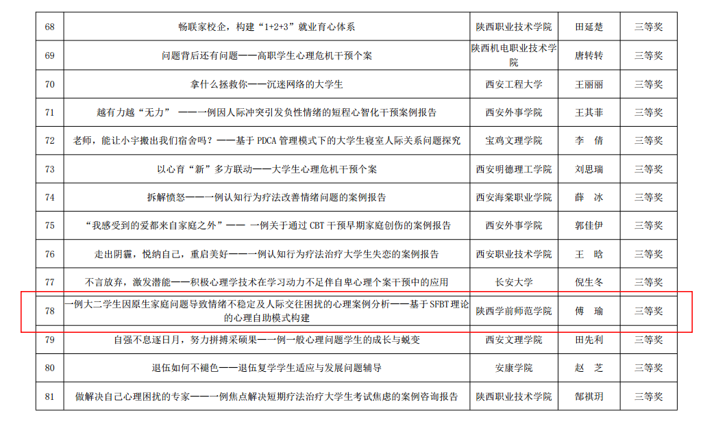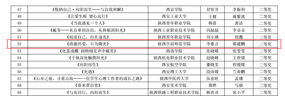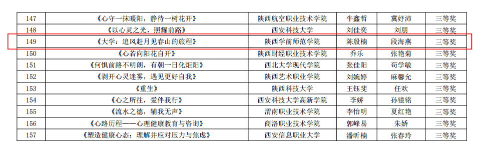 6月25日,陕西省教育厅对第九届陕西高校“阳光护航”心理育人宣传季省级有关活动获奖情况进行了通报。申搏有4项获奖,分别是信息工程学院辅导员傅瑜撰写的《一例大二学生因原生家庭问题导致情绪不稳定及人际交往困扰的心理案例分析--基于SFBT理论的心理自助模式构建》获2024年陕西高校学生心理健康教育指导典型案例三等奖;教育科学学院学生李童言撰写的《清澈的爱、只为微光》、幼儿教育学院陈殷楠撰写的《大学:追风赶月,见春山的旅程》分别获第三届陕西高校大学生“心相遇 爱同行——心理健康伴我成长”主题征文二等奖和三等奖,辅导员郭建鹏、段海燕分别获优秀指导教师荣誉;学生处心理健康专职教师惠晓薇在第三届陕西高校学生心理健康教育课程教学展示活动中获优秀表现奖。