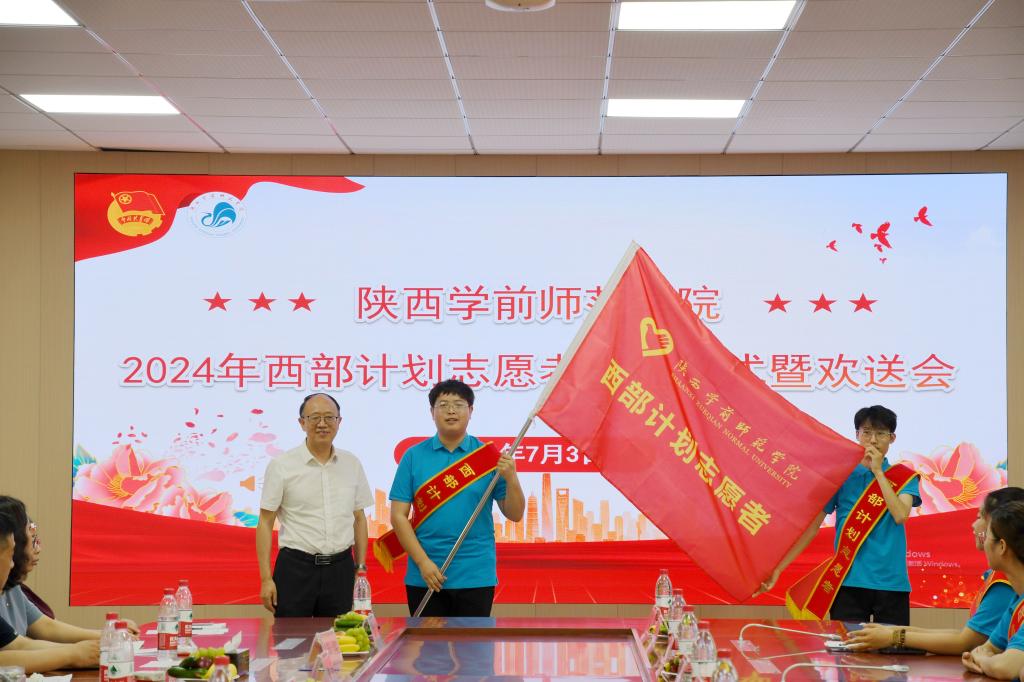 活动期间,唐宏向学校2024年西部计划志愿团授旗,并为志愿者赠送了学校文创纪念品和《创业史》、《永远的榜样》等书籍。