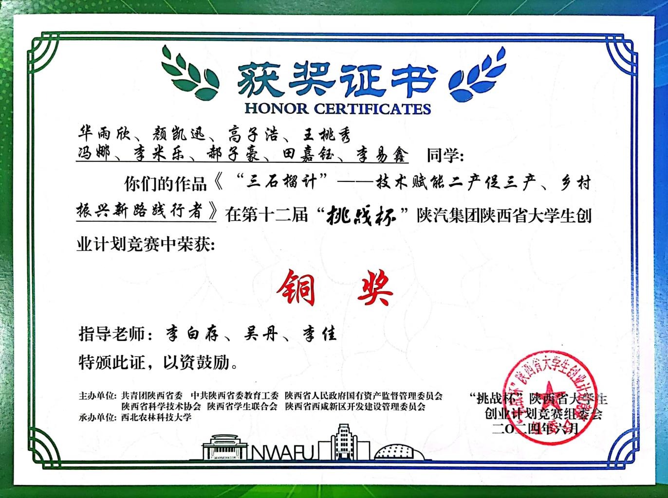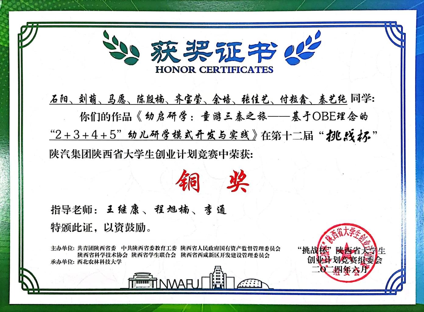 此次竞赛自今年4月启动以来,共有87所高校的1071件作品报名参赛,参赛高校和作品数量均创新高。为了做好省赛的备赛工作,学校于3月启动校级选拔赛事组织动员工作,联合教务、科研部门广泛发动,积极调动专任教师、学生的参与热情,在学校形成了良好的竞赛氛围。4月19日,按照省赛评审规则,校团委特邀团中央挑战杯创业计划竞赛导师、兄弟高校共青团创新创业领域专家对校赛申报作品进行仔细筛选,并对校赛遴选推荐入围省赛项目进行专项打磨与实战演练。申搏15件作品入围省赛,项目内容涵盖科技创新和未来产业、乡村振兴和农业农村现代化、城市治理和社会服务、生态环保和可持续发展、文化创意和区域合作5个组别。经过激烈角逐,申搏“幼启研学:童游三秦之旅---基于OBE理念的‘2+3+4+5’幼儿研学模式开发与实践”、“‘三石榴汁’---技术赋能二产促三产、乡村振兴新路践行者”、“‘五感一体、多维触达’---基于昆虫科普的乡村振兴新模式”、“秦匠遗韵---探索陕西非遗的数字化之旅”、“秦潮藏玩---千年秦腔一声吼、吼出中国新成就”、“青春告白乡村---电商助力乡村振兴”等6个项目荣获省级铜奖,为申搏“挑战杯”大学生创业计划竞赛获奖数量历年之最。