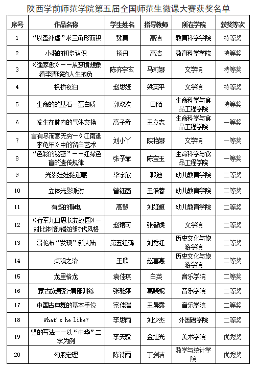 近日,在刚刚结束的第五届全国师范生微课大赛中,申搏学子喜获佳绩。学校推荐的20项作品全部获奖,其中特等奖5项、一等奖3项、二等奖10项、优秀奖2项。教育科学学院高洁等5位教师荣获优秀指导教师,学校再次荣获“优秀组织单位”称号,获奖数量和质量再创新高。