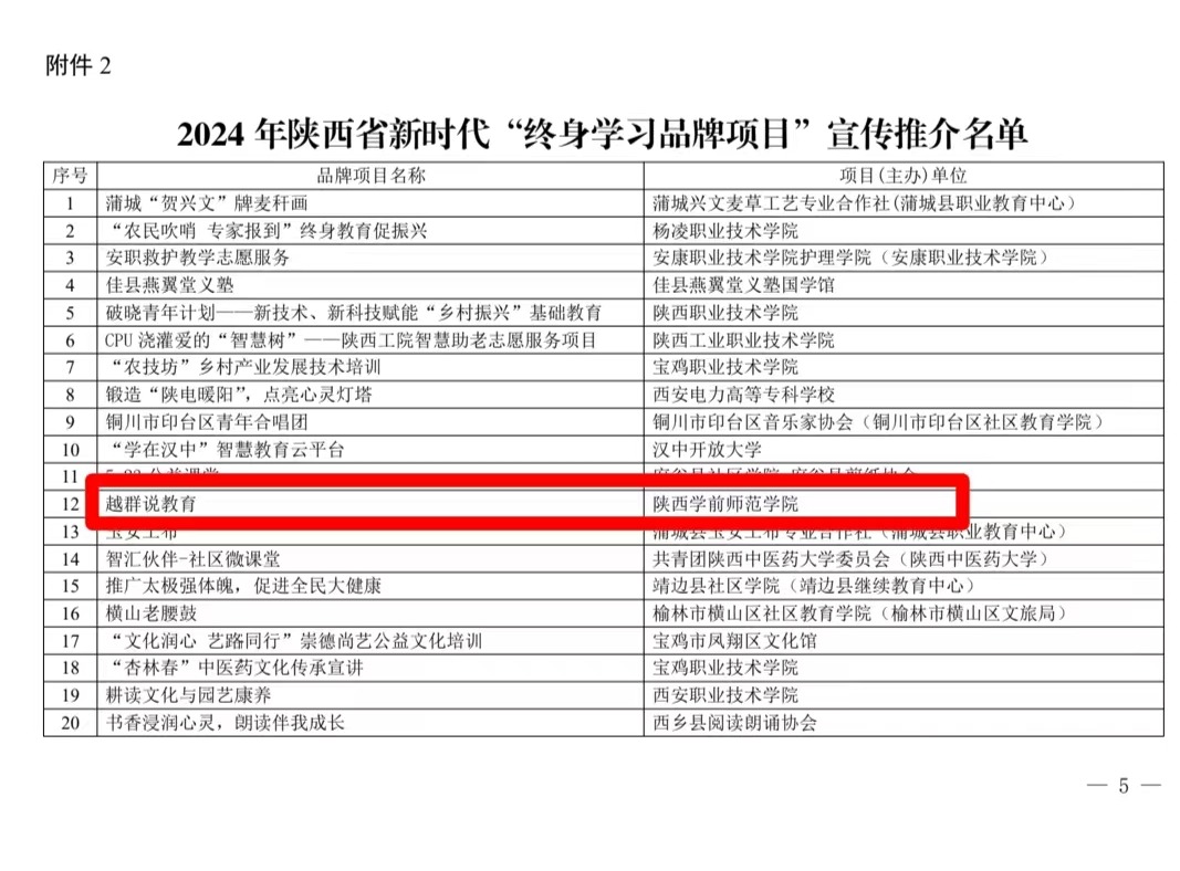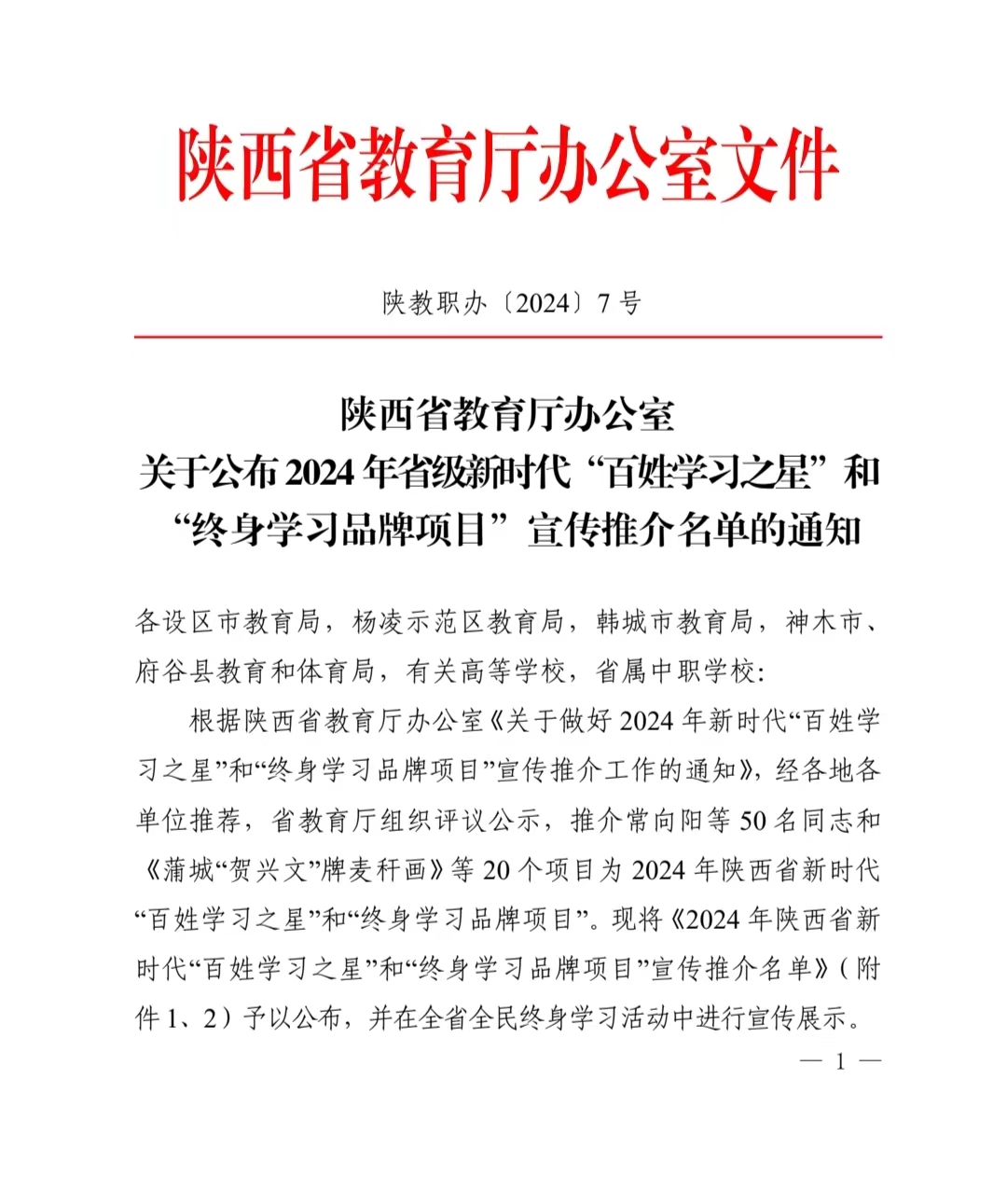 近日,陕西省教育厅下发《陕西省教育厅办公室关于公布2024年省级新时代“百姓学习之星”和“终身学习品牌项目”推介名单的通知》,申搏王越群教授主持的“越群说教育”项目荣获陕西省新时代“终身学习品牌项目”称号。这是申搏在学习型校园创建活动中,继一名教师荣获“百姓学习之星”称号之后取得的又一项成果。