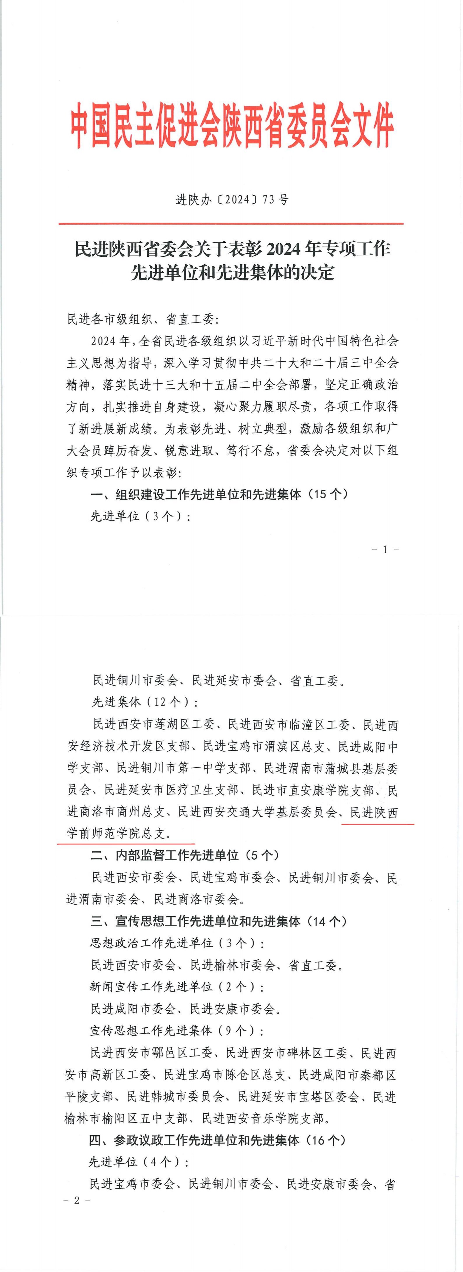 近日获得喜讯,申搏民进总支委员会等12个基层组织因工作突出,各项工作取得了新进展新成绩,被民进陕西省委会授予2024年“组织建设工作先进集体”荣誉。