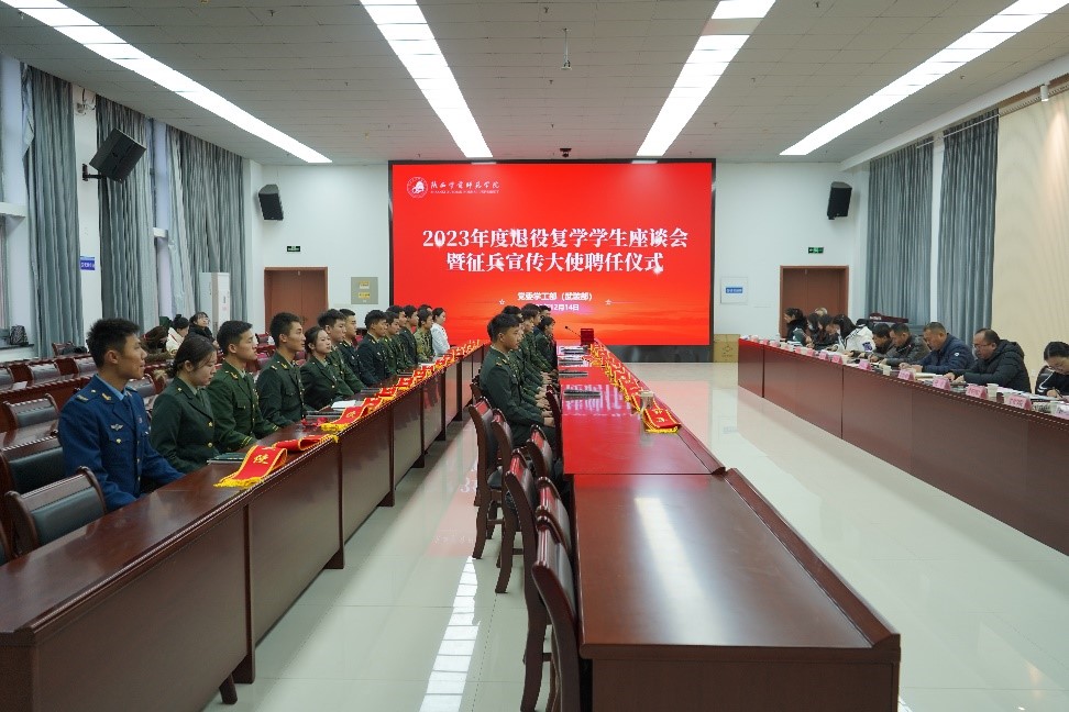 12月14日上午,学校在长安校区图书馆举行2023年退役大学生座谈会暨征兵宣传大使聘任仪式。党委学工部、教务处、保卫处、后勤服务集团、团委有关负责人,各二级学院党委副书记,2023年退役复学学生及往年退役学生代表参加了会议。