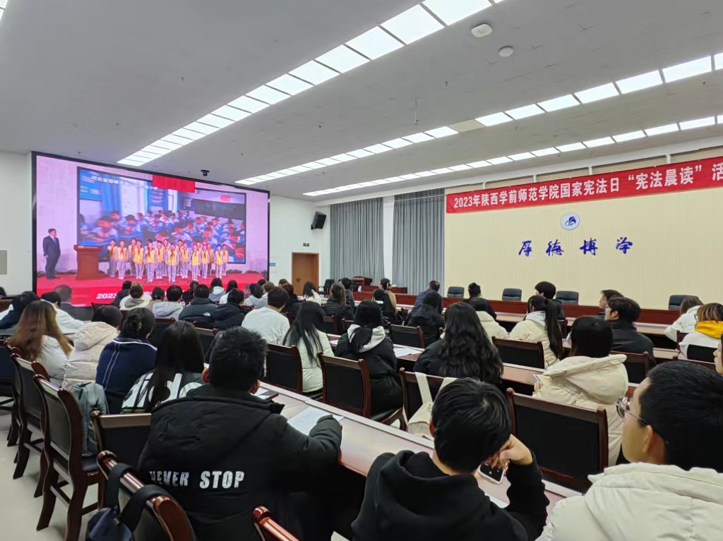 2023年12月4日上午,由教育部统一组织开展以“大力弘扬宪法精神,建设社会主义法治文化”为主题的“宪法晨读”活动。申搏学工部副部长王成富,教育管理科工作人员以及各学院学生代表在图书馆三楼报告厅通过普法网直播,参与了教育部开展的教育系统“宪法晨读”活动,共读《宪法》部分条款等。在场学生认真聆听教育部领导讲话,参会学生深刻体悟法治精神,感受宪法权威。