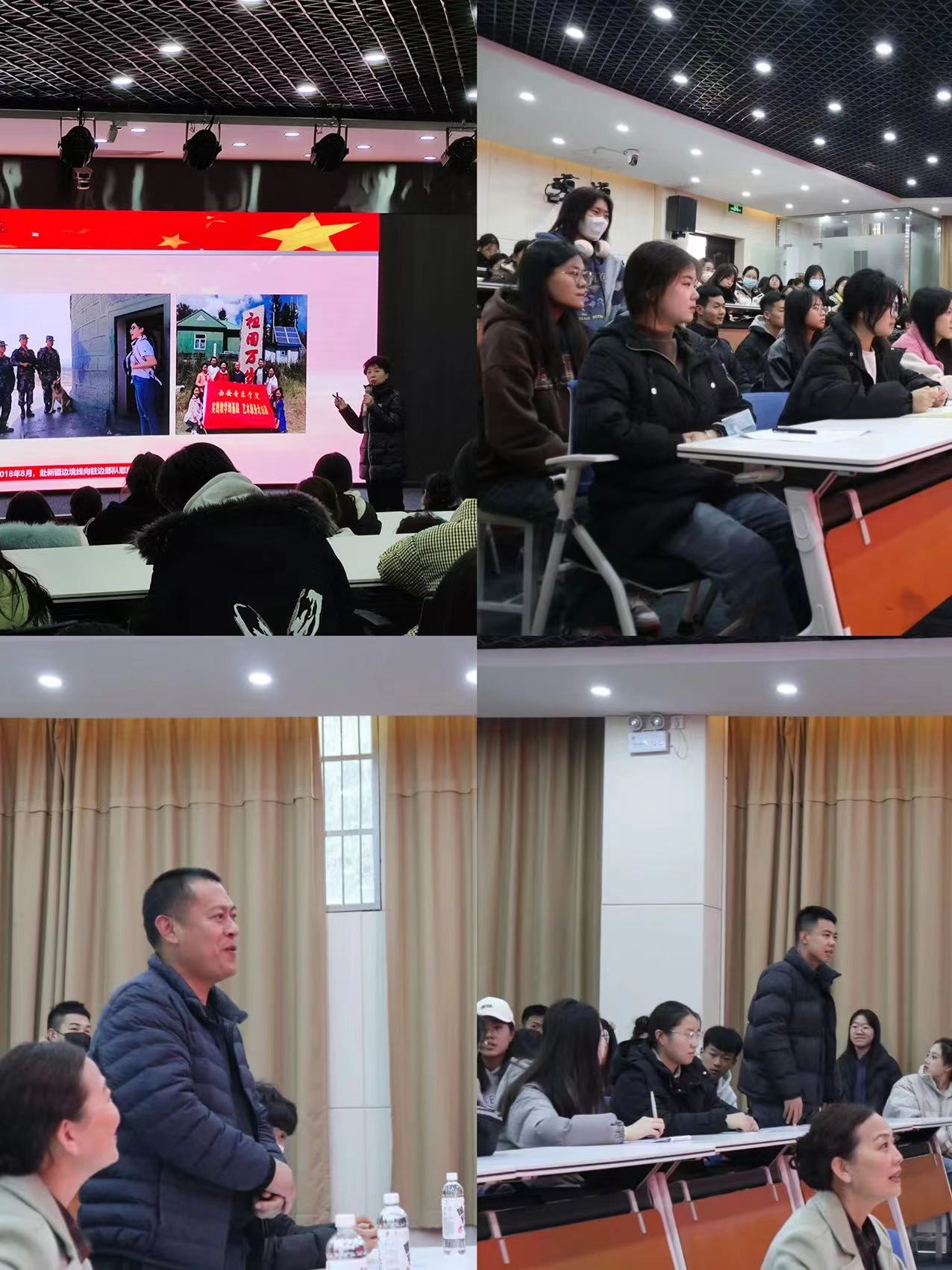 张教授从“重走总书记视察之路、站在哨所上倾情献艺、参观学习当地纪念馆、与边防战士联手表演”四个方面,用生动风趣的语言讲述了边防战士在艰苦及恶劣的环境中保家卫国、无私奉献的爱国主义精神。在现场,她饱含深情的朗诵了一位边防小战士牺牲前写给妈妈的信,在场的所有人无不深受触动,激发了学生的爱国情、报国志。尤其是在讲座中张教授还与申搏部分退伍复学的学生亲切交流了在部队的收获与体会。张教授也对在座的学生提出了殷切期望,希望大家继续发扬人民军队的光荣传统,传承红色文化,厚植爱国情怀。坚持学业为本,立大志,明大德,成大才,担大任。