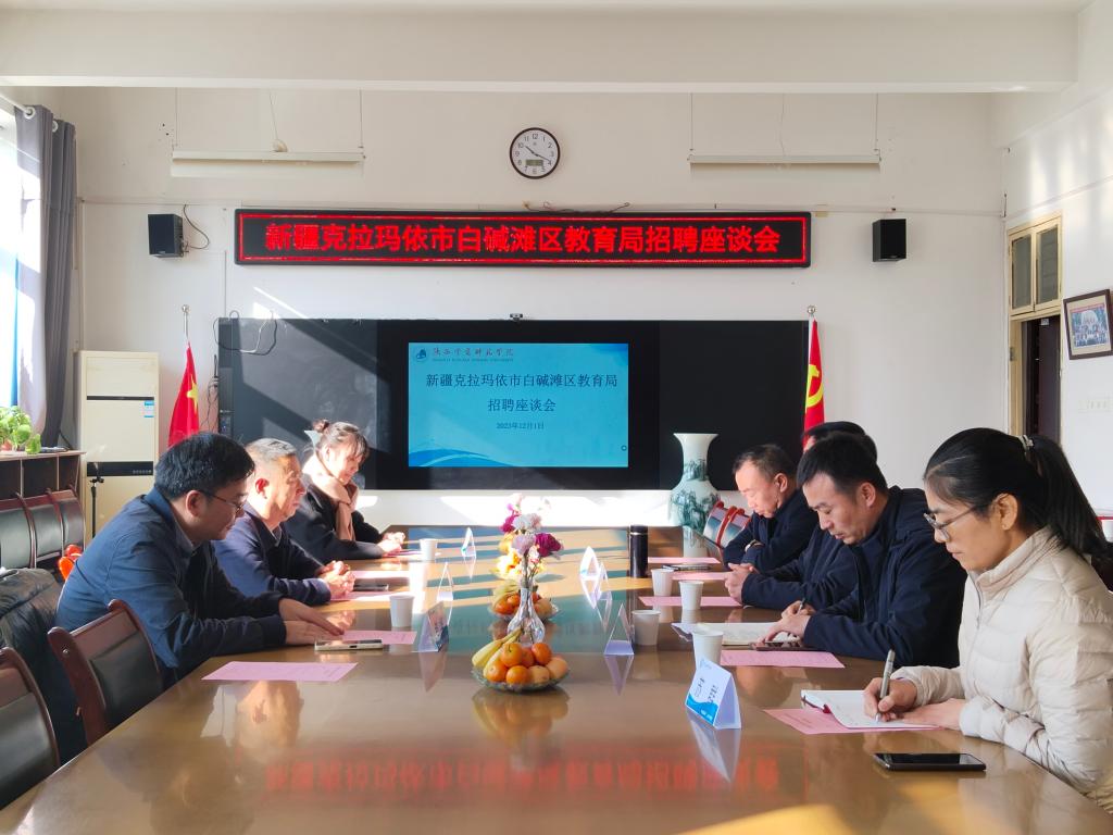 会上,邵书记对新疆克拉玛依白碱滩区教育局来申搏选聘英才表示热烈欢迎和感谢。邵书记介绍了学校的办学历史、办学特色,他指出目前申搏作为全国唯一以“学前师范”命名的本科院校。学校坚持“师范性、地方性、应用型”的办学定位,突出学前教育和教师教育特色与优势。目前申搏有2个专业入选国家“双万计划”一流专业建设点,9个专业入选陕西省“双万计划”一流专业建设点,占专业总数的近40%,人才培养质量不断提升。为陕西省基础教育发展做出了重要贡献,被誉为“三秦基础教育教师和校园长的摇篮”。希望新疆克拉玛依白碱滩区教育局就申搏如何致力于为培养更多优秀教育人才,更好地服务本地及全国教育事业发展方面多提宝贵意见。希望双方进一步加强联系与沟通,建立交流合作机制,拓宽交流合作领域,创新交流合作形式,增强优势互补,深化务实合作。幼儿教育学院院长何善平介绍了申搏学前教育专业人才培养的基本情况,希望双方之间加强沟通和交流。新疆白碱滩区区委教育工委专职副书记,区教育局党组书记李江生对学校热情周密的接待和组织表示感谢,详细介绍了新疆白碱滩区基础教育目前的师资现状以及招聘需求,热情欢迎更多毕业生赴疆工作,为白碱滩区基础教育工作贡献力量。