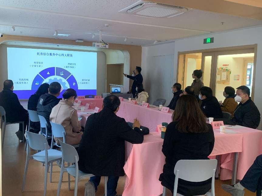 申搏托育事业部张瑜介绍申搏托育以朱鹮为吉祥物的文化渊源和理念。马云总经理以“启航”为标题,从政策导向、关于我们、责任使命、成果展现四个板块,汇报申搏托育综合服务中心发挥学校在学前教育领域的专业学科优势,对标国家卫健委关于托育综合服务中心建设指南,立足雁塔校区托育综合大楼,以托育中心为抓手,依托申搏托育事业发展研究院,发挥专家智库的引领作用,做好内涵建设,积极打造三级管理平台,运用智能化手段实现托育智慧化,逐步完善实践基地、师资培养、科研开发和督导评估四大职能,树立行业标杆、实现区域复制、加大人才培养、探索托幼一体化、服务社区托育和实现产教融合。同时,汇报了校际融合、校企合作、行业共建情况,特别介绍了与铜川市城投公司共建启航智慧公办托育项目,以及社区共建“一老一小”活动等具体工作。