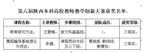 本次大赛聚焦本科教学创新实践,汇聚全省各高校优秀教师同台竞技,竞争激烈。学校教育科学学院王碧梅老师依托《教育研究方法》课程,以系统的教学创新思路与鲜明的学科特色荣获新文科组三等奖;音乐学院李健老师依托《舞蹈编导基础理论与技法》课程,凭借兼具思想性与实践性的教学设计荣获课程思政组三等奖。
