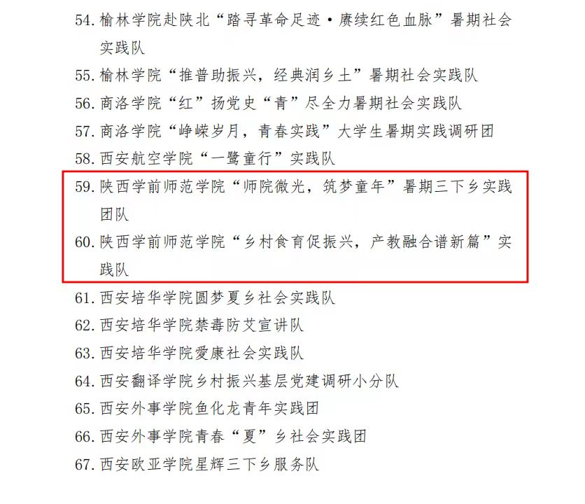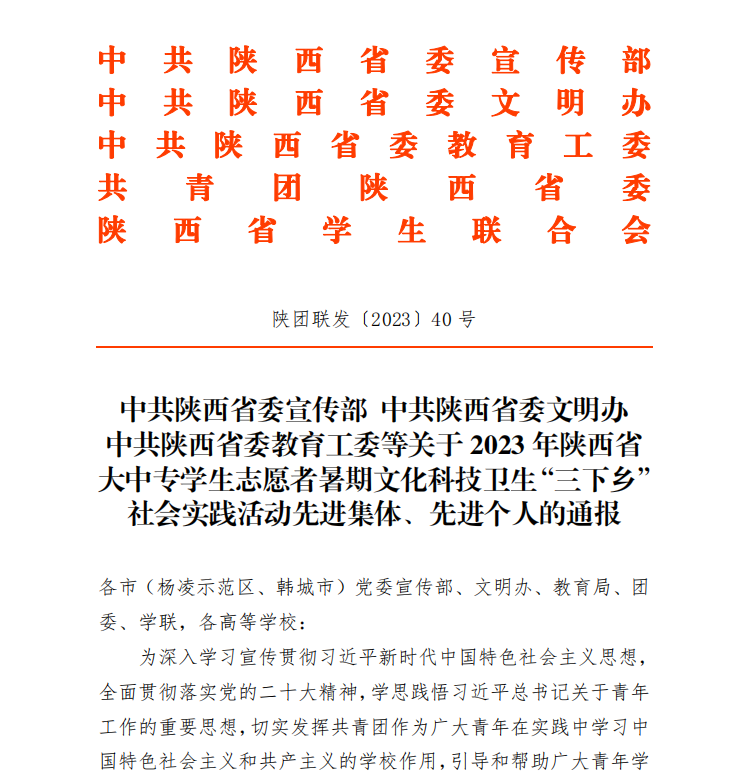近日,省委宣传部、团省委、省教工委、省文明办、省学联联合发布了《关于2023年陕西省大中专学生志愿者暑期文化科技卫生“三下乡”社会实践活动先进集体、先进个人的通报》。学校荣获2023年陕西省暑期“三下乡”社会实践活动优秀组织单位;幼儿教育学院“师院微光 筑梦童年”实践队和生命科学与食品工程学院“乡村食育促振兴 产教融合谱新篇”实践队分别荣获省级优秀团队;程旭楠同志和张振华同志分别荣获2023年陕西省暑期“三下乡”社会实践活动先进个人称号。