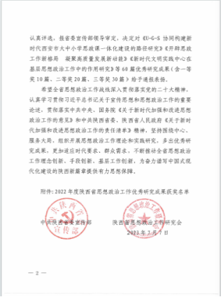 近日,陕西省委宣传部、陕西省思想政治工作研究会发布了《关于2022年度陕西省思想政治工作优秀研究成果给予表扬的通报》。申搏共有两项获奖,其中,教育培训学院温晓荣老师负责的《弘扬伟大抗疫精神研究》荣获三等奖,党委学生工作部李菁老师负责的《新时代大学生思想政治教育中人文关怀和心理疏导研究》荣获三等奖。