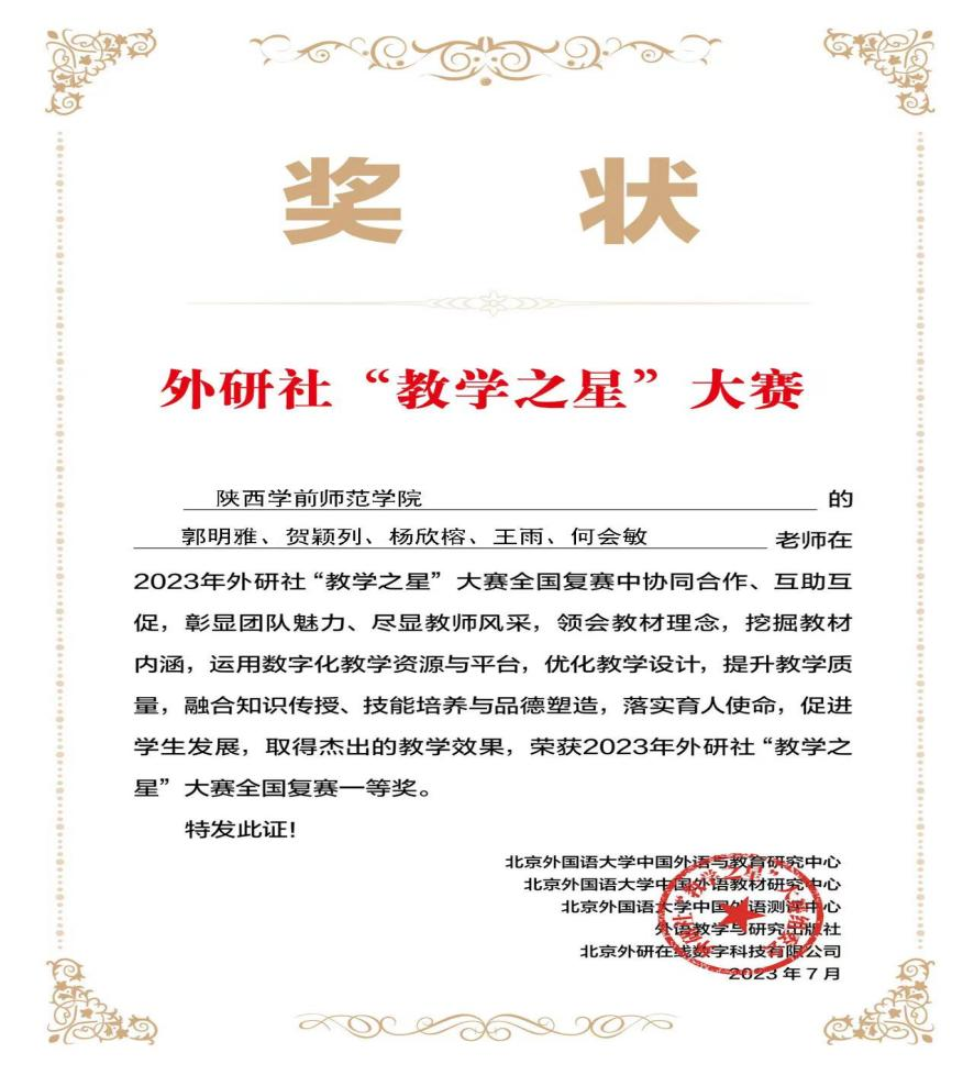 外研社“教学之星”大赛自创办以来,在全国高校外语教育领域广受认可,被连续列入中国高等教育学会“全国普通高校教师教学发展指数”。外研社2023“教学之星”大赛全国复赛于2023年6月19日落下帷幕,申搏外国语学院英语专业教学团队、大学英语教学团队从全国340个参赛团队中脱颖而出,取得突破性佳绩,喜获全国复赛两个一等奖。这是继2022年申搏大学英语教学团队获得此项赛事全国复赛一等奖之后所取得的又一大教师参赛佳绩。