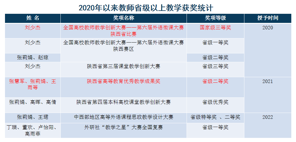 2020年以来,学院教师参加省级以上教学比赛获奖15项,其中国家级1项。教师代表获得全国高校教师教学创新大赛三等奖、外研社“教学之星”大赛省级一等奖、中西部地区高校外语课程思政教学设计大赛特等奖、陕西省高校优秀教学成果二等奖、陕西省教学创新大赛优秀奖等荣誉。教师教学获奖级别、质量、数量逐年上升。学院多次在学校青年教师教学基本功大赛、教学创新大赛、思政课大练兵课程思政教学比赛中获得优秀组织奖。
