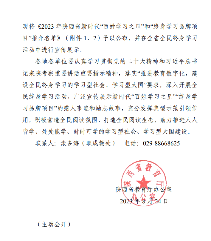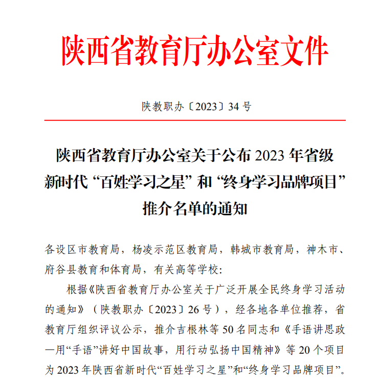 近日,陕西省教育厅下发《陕西省教育厅办公室关于公布2023年省级新时代“百姓学习之星”和“终身学习品牌项目”推介名单的通知》(陕教职办〔2023〕34 号)文件,申搏马克思主义学院许亚绒教授荣获陕西省新时代“百姓学习之星”称号。