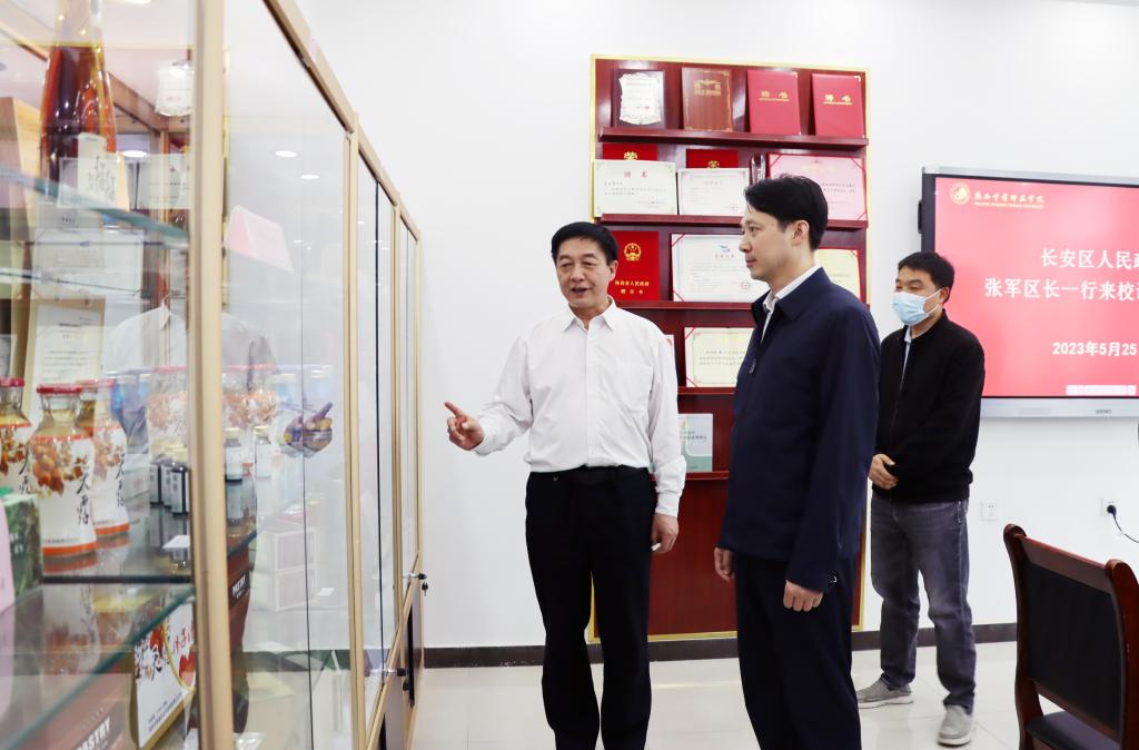 5月25日上午,长安区委副书记、区长张军一行来申搏调研交流。校党委书记、校长邵必林热情接待了张军一行。学校在积学楼生物工程研究院成果展示室召开座谈会,党政办公室、学科建设与科研处有关负责人及生命科学与食品工程学院教师代表参加座谈。座谈会由副校长唐宏主持。