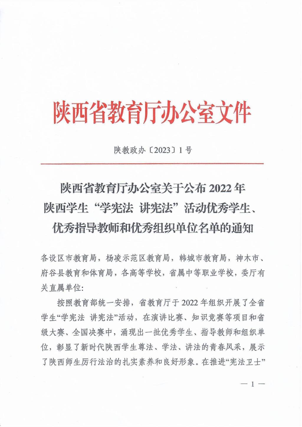 近日,陕西省教育厅发文对全省教育系统2022年组织开展宪法学习宣传教育活动表现突出的集体和个人予以表扬,申搏被评为“学宪法 讲宪法”活动优秀组织单位。