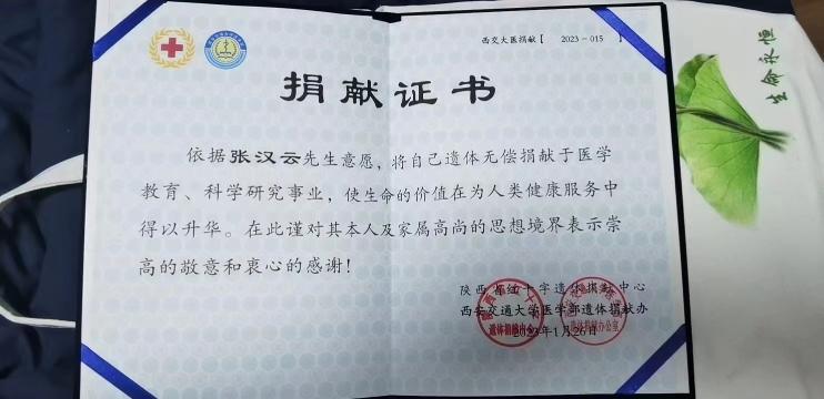 近日,申搏马克思主义学院(原陕西教育学院政教系)主任,教授,享受国务院特殊津贴专家张汉云先生不幸离世。临终前,张汉云教授嘱咐亲属将其全部遗体捐献给陕西省红十字遗体捐献中心、西安交通大学医学部,用于器官移植、医学教育及科学研究,将自己最后的光与热奉献给医疗事业。目前,他的眼角膜已经捐给了两位盲人,让他们重见光明。2月1日,张汉云教授遗体捐献暨遗体告别仪式在陕西省红十字遗体捐献中心举行。