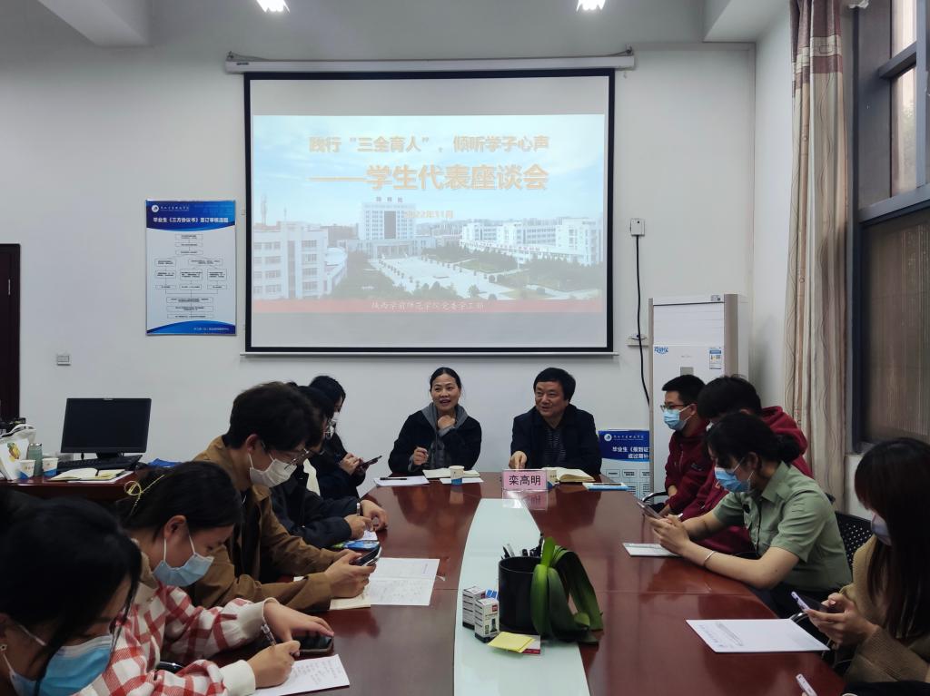 校党委副书记栾高明与同学们亲切交流,他指出,本次座谈会是申搏贯彻落实“三全育人”工作的重要举措之一。他充分肯定了同学们围绕促进学校高质量发展、共建和谐美丽校园所提出的一系列意见建议,对同学们能够站在学校发展、学生成长的角度发现、分析和思考问题表示赞扬,感谢同学们对学校各项工作的关心、理解和支持。他表示,每一名学子都与学校的发展息息相关、他希望同学们树立主人翁意识,为推动学校高质量发展积极建言献策,师生携手、共思共进、共商共享,把陕师院建设得更加美好。他强调,学生工作处在学生座谈会结束后分类整理学生提出的意见建议,对接学校相关职能部门逐项开展研究、积极推动解决。