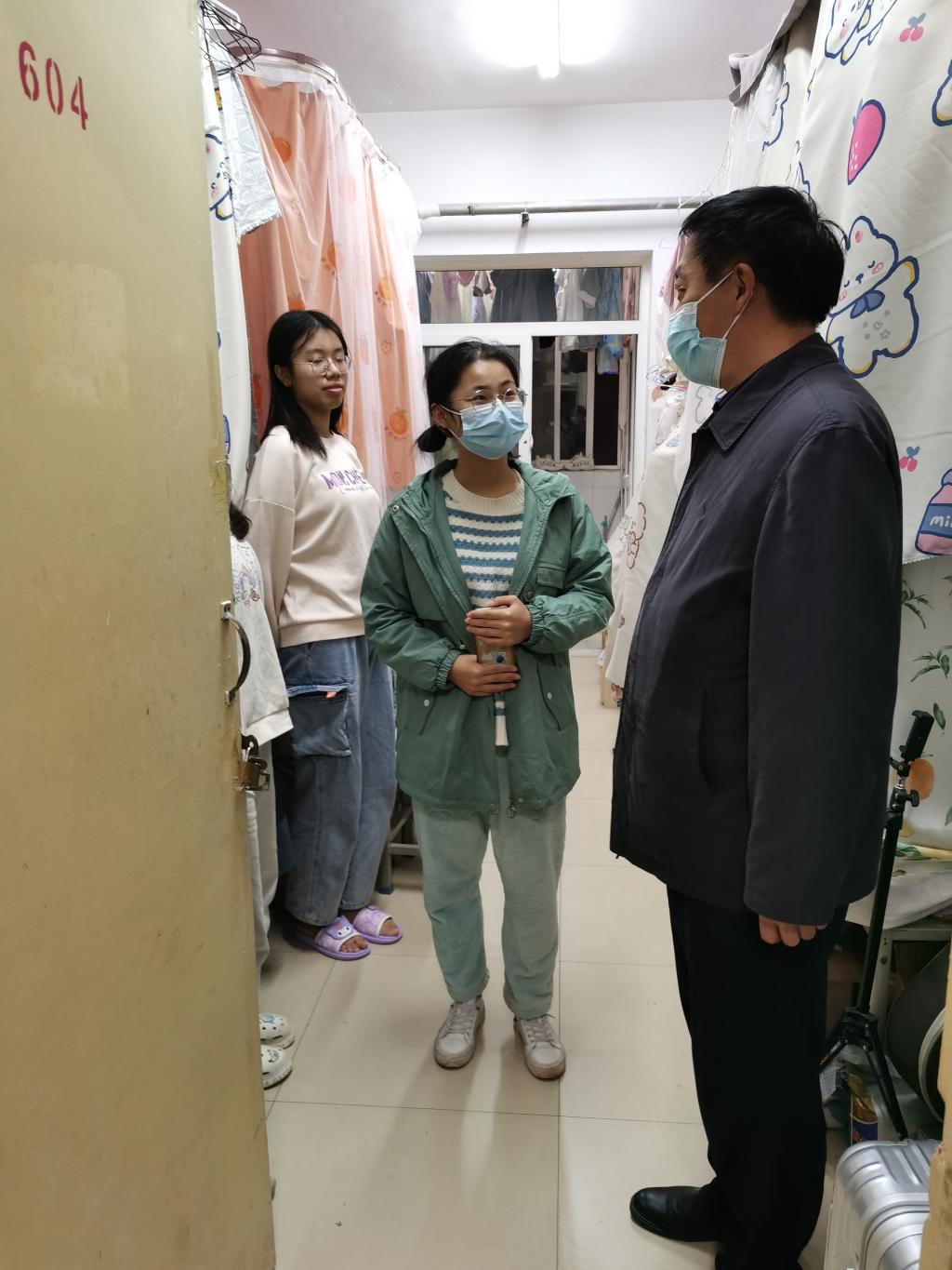 邵必林先后走访了2021级小教本科一班位于7号楼601-604和4栋503学生宿舍的寝室。每走进一间宿舍,邵必林都亲切地与学生们交谈,询问在疫情防控的特殊时期日常生活与专业学习是否顺利。当得知一位同学学习上有困难时,他分享了自己的大学学习方法,鼓励同学们进一步明确学习目标,如何有意义的度过大学生活。邵必林书记结合个人大学学习和生活的体会,请同学们经常思考三个问题:1.为什么上大学?2.为谁上大学?3.怎样上大学。并强调大学期间应该做到五个学会:一是学会做人,二是学会做事,三是学会求知,四是学会共处,五是学会生活。邵校长的谆谆教诲,让同学们心中充满温暖!