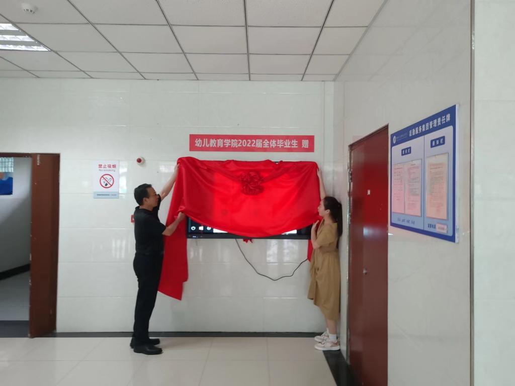 2022届毕业生代表王曦发言,她表示对母校四年的关心培养和老师们的辛勤付出致以衷心的感谢。作为新时代的幼教人,将秉承“人生百年,立于幼学”的院训,始终保持奋斗姿态,坚守教育初心,为“幼有所育”贡献自己的青春力量。毕业生们为学院学前教育实训楼捐赠多媒体教学一体机,以此礼物表达全体毕业生对母校、对幼儿教育学院的感恩和一片深情,同时也希望物尽其用,发挥其宣传、展示学前教育实训室功能的窗口。