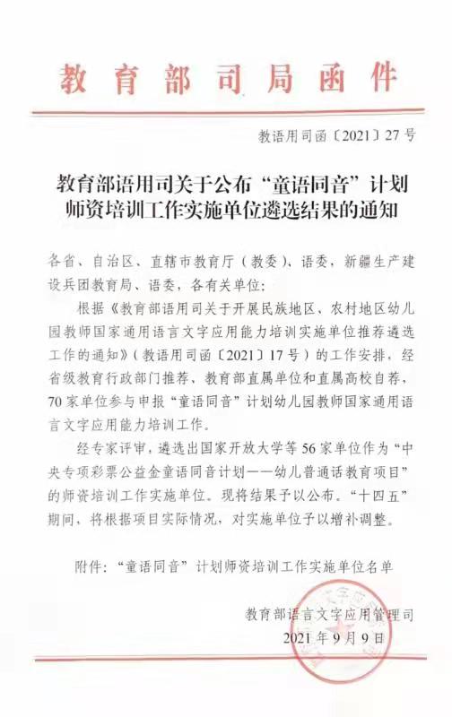 日前,教育部语言文字应用司印发《关于公布“童语同音”计划师资培训工作实施单位遴选结果的通知》《关于开展2021年“童语同音”计划师资培训工作的通知》,申搏与北京大学等56家单位入选“童语同音”计划师资培训工作实施单位;申搏与北京师范大学、西南大学等30家单位获批开展2021年“童语同音”计划(师资培训工作),对口甘肃省甘南藏族自治州舟曲县、卓尼县,通过集中面授、送培到县等方式对两县200名幼儿园教师开展国家通用语言文字应用能力培训。
