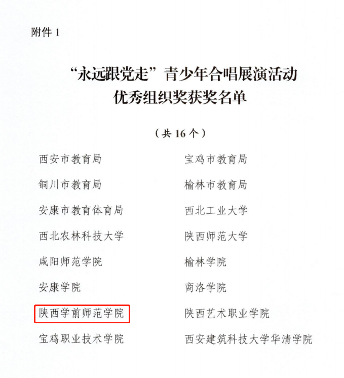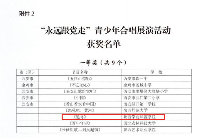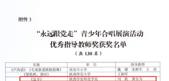 白露至,桂花香,秋意浓,又是一年丰硕的金秋。近日,由陕西省教育厅、陕西省广播电视局、陕西广电融媒体集团联合开展的庆祝中国共产党成立100周年“永远跟党走”青少年合唱展演活动揭晓了评选结果。由申搏音乐学院“追梦合唱团”精心排演的合唱歌曲《追寻》荣获一等奖,合唱团指挥刘凯、钢琴伴奏黄乐为荣获“优秀指导教师”称号,学校获“优秀组织奖”称号。