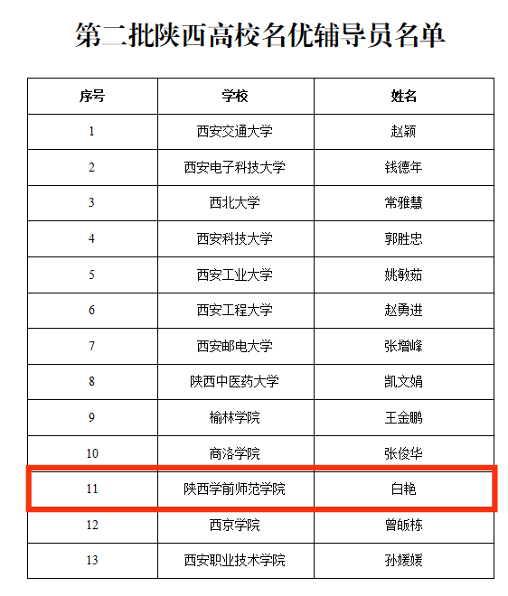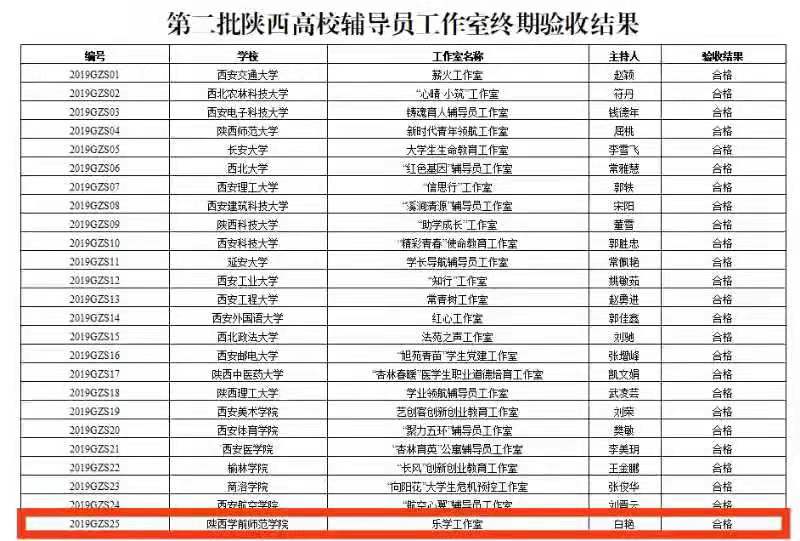 近日,中共陕西省委教育工委下发《中共陕西省委教育工委关于公布第二批陕西高校辅导员工作室终期验收结果和2019年陕西高校辅导员工作精品项目结项验收结果的通知》(陕教工〔2021〕174 号),经立项建设、中期考核、终期验收和结果公示等程序,申搏“乐学工作室”顺利通过终期验收并被授予“陕西高校省级辅导员示范工作室”,工作室主持人白艳同志被授予“陕西高校名优辅导员”荣誉称号。