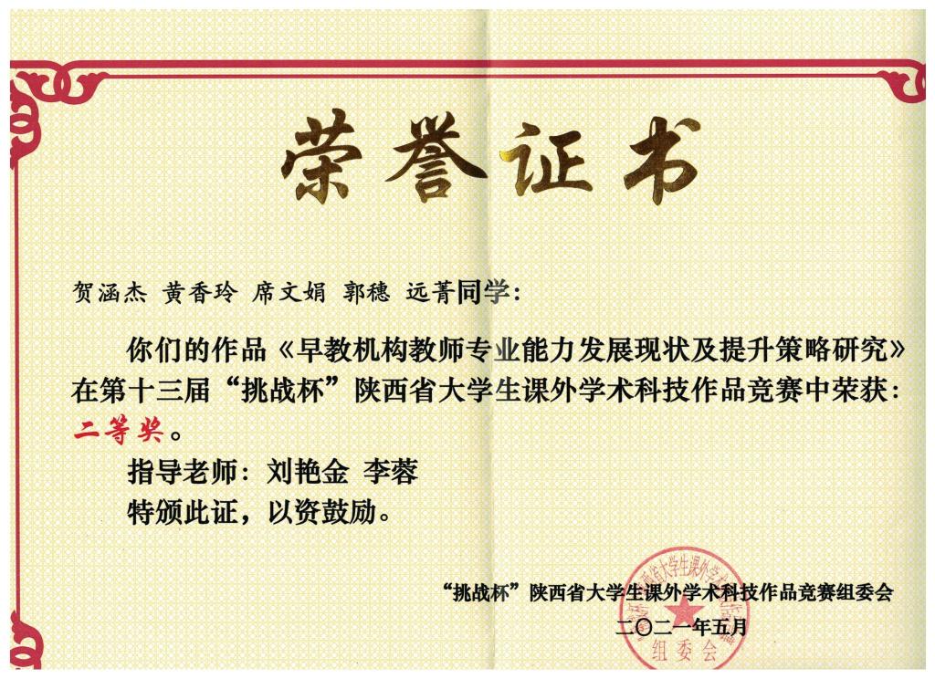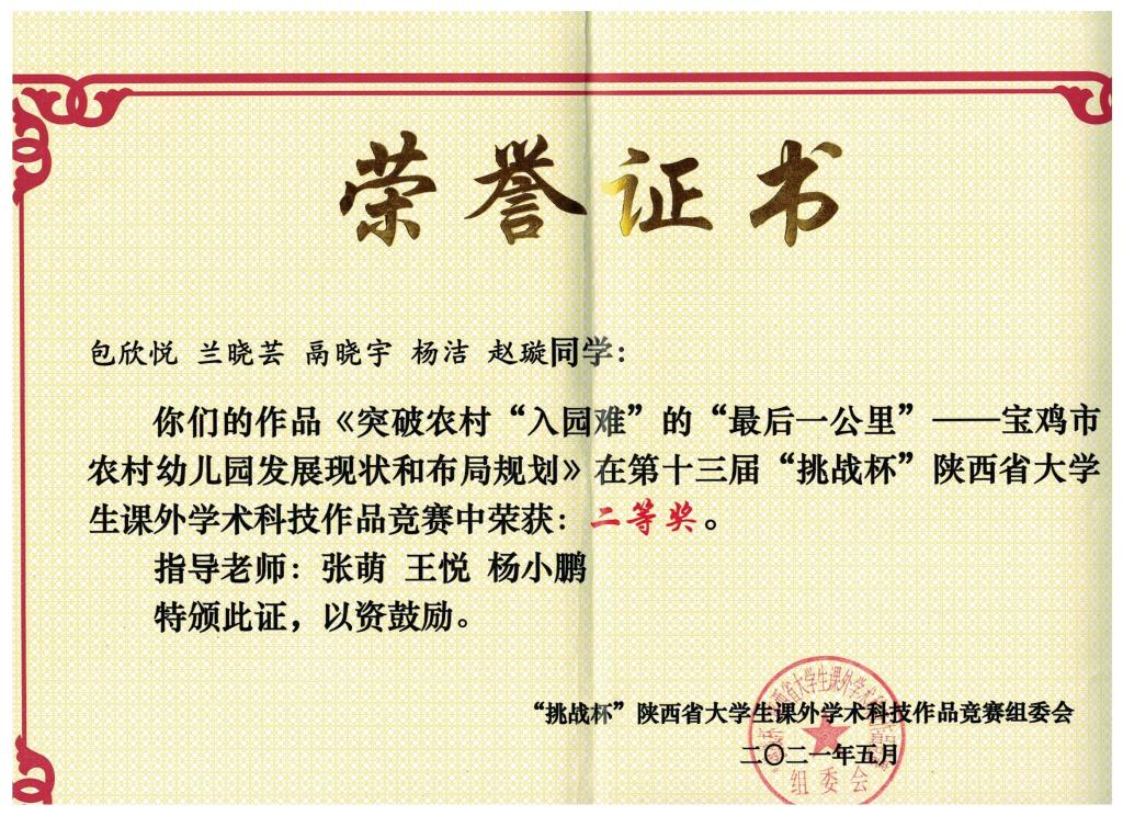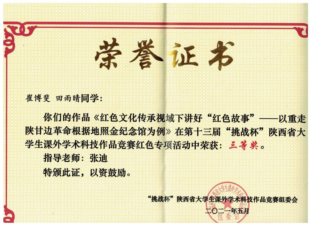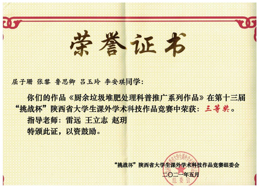 5月22日,由共青团陕西省委、中共陕西省委教育工委、陕西省科学技术协会、陕西省社会科学院、陕西省学生联合会共同主办的第十三届“挑战杯”陕西省大学生课外学术科技作品竞赛在陕西师范大学长安校区终南音乐厅落下帷幕。在本届陕西省“挑战杯”竞赛中,我校遴选推荐的6件主赛道作品4件获奖,其中一等奖1项,二等奖2项,三等奖1项,红色专项活动获三等奖1项。