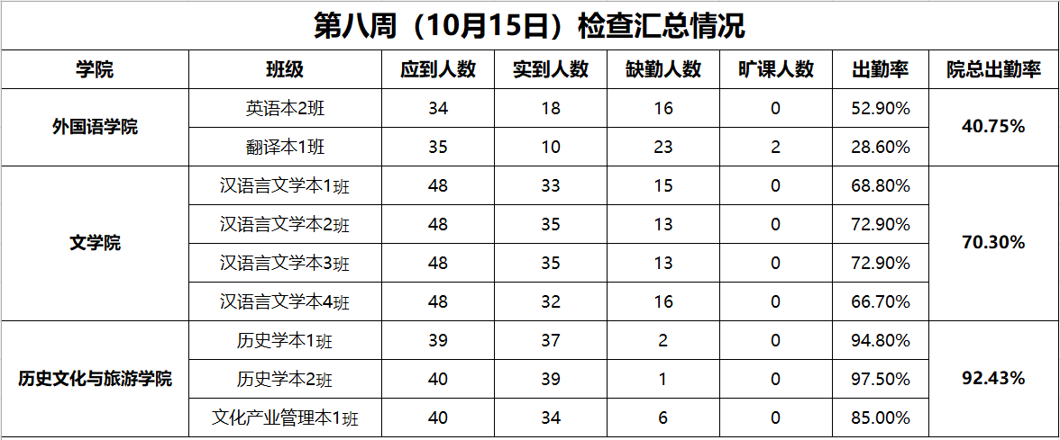 为营造良好的学习环境,形成浓厚的学习氛围。同时进一步加强学生管理工作,根据《关于做好2024级学生晚自习安排的通知》(陕师院学函〔2024〕82号)文件要求,学生处组织校学管会对晚自习出勤情况进行抽查监督,现将2024—2025学年第一学期第8周晚自习情况通报,具体内容如下: 学 生 处 2024年10月21日