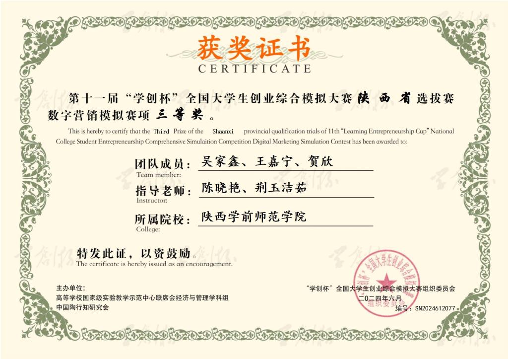 6月22日,第十一届“学创杯”全国大学生创业综合模拟大赛陕西赛区选拔赛成功举办,历史文化与旅游学院文化产业管理代表队参赛数字营销赛道,分别荣获陕西省省级二等奖、三等奖各一项。