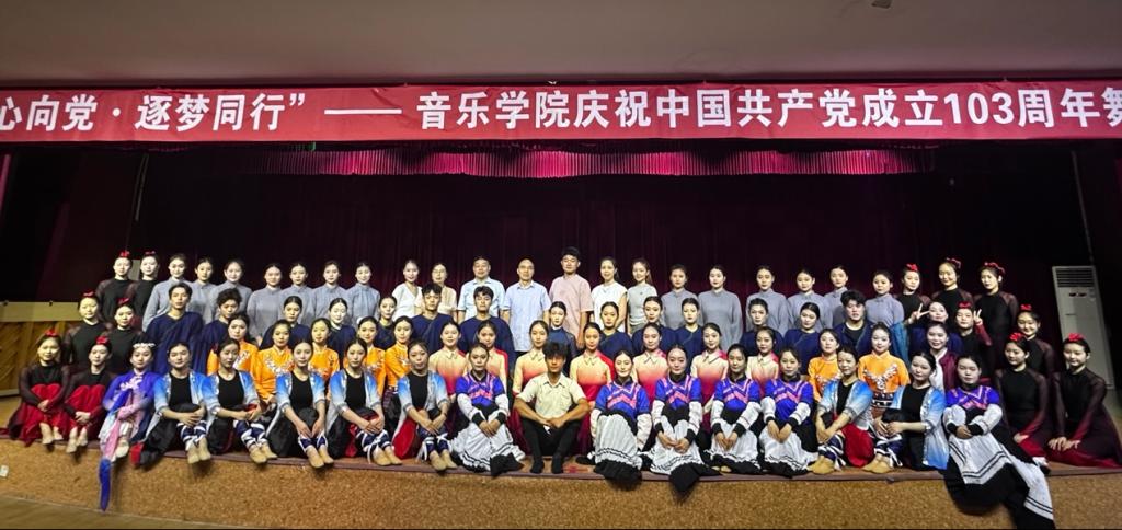为隆重庆祝中国共产党成立103周年,进一步弘扬伟大建党精神,增强凝聚力,激发爱国斗志和创新活力,6月26日晚,音乐学院在大学生活动中心举办“艺心向党·逐梦同行”舞蹈晚会。校党委副书记权秋虎与学院师生共同观看演出。