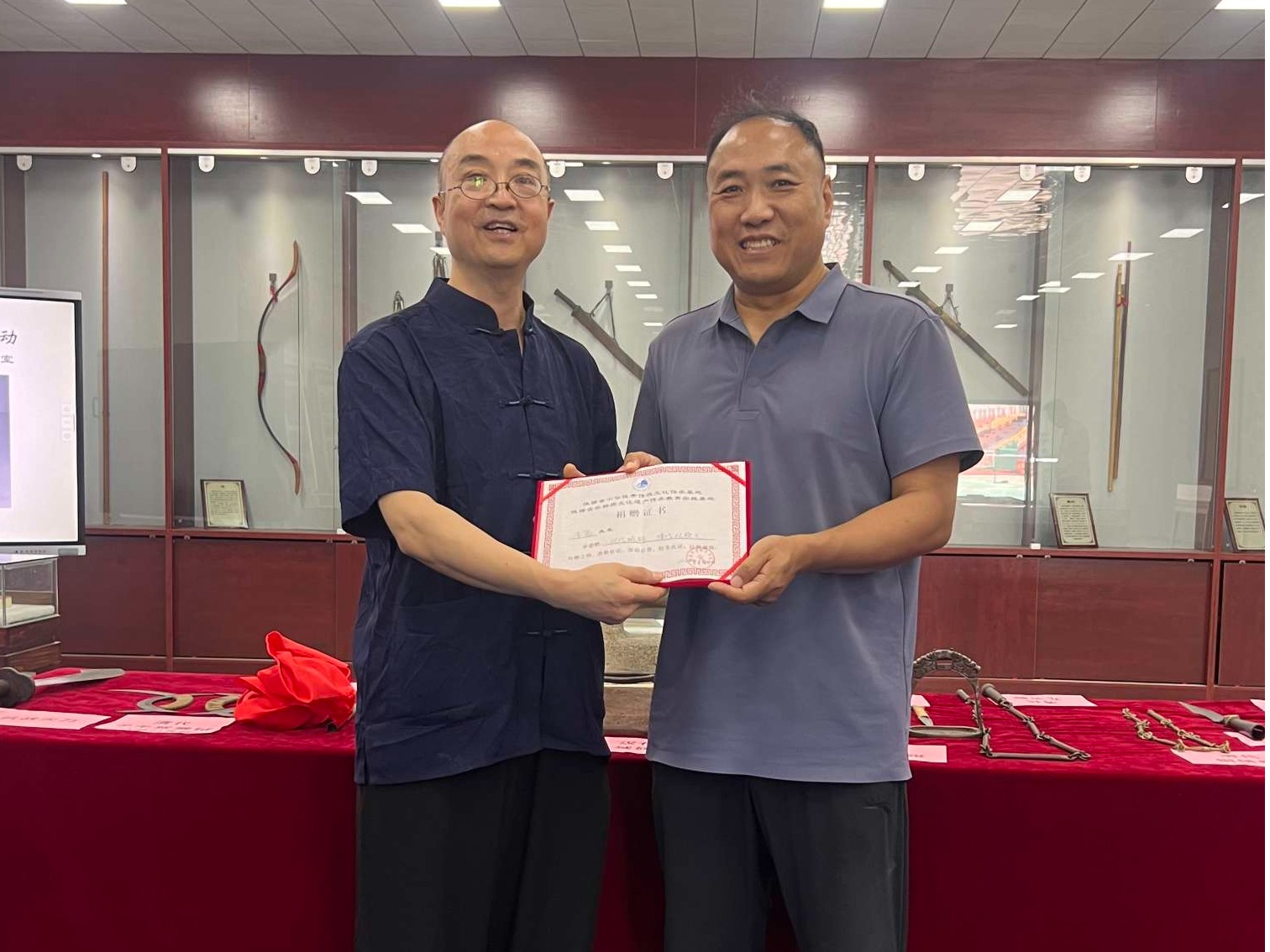 6月20日申搏特聘请古陶瓷、古兵器收藏家,“器说文明·用古物讲述中国”系列文化公益活动,分享人李鬼先生在申搏传承基地纪念馆举办主题为“古兵器进校园宣展活动”,近200多名师生参加了这次宣讲活动。随着李鬼先生对不同时期的古兵器的详细讲解,师生们进行了一次时空之旅,看到了距今七八千年前新石器时代的石斧,战国的青铜剑、青铜矛,明清以来的各种兵器和抗战时期的环首大刀,深刻感受中国尚武文化的智慧。本次宣讲活动李鬼先生为申搏传承基地纪念馆捐赠了两件古物:汉代城砖和清代双股叉。为表谢意,体育学院邵晓军院长为李鬼先生颁发了捐赠证书。这次传承基地武术文化工作坊系列活动使申搏师生深刻感受到了文化传承的力量,认识到新时代大学师生传承中华优秀传统文化的责任。在今后的学习工作中,我们当坚持以习近平新时代中国特色社会主义思想为指导,根植中华优秀传统文化深厚土壤,以社会主义核心价值观为引领,以立德树人为根本,以传承中华优秀传统文化为宗旨,进一步挖掘中华优秀传统文化价值内涵,进一步激发中华优秀传统文化的生机与活力,进一步增强文化自觉和文化自信。