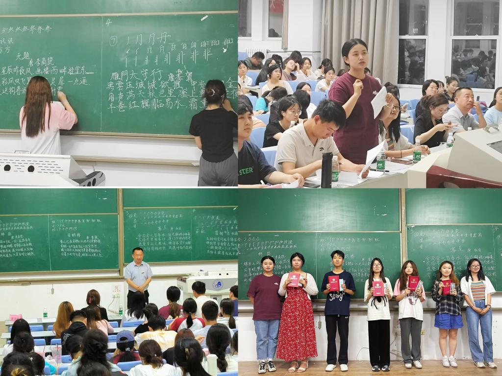 为进一步提升师范生书写技能,大力弘扬践行教育家精神,2024年5月22日晚7时,文学院在博文楼A3阶梯教室举办首届师范生粉笔字大赛。本次比赛邀请文学院党委书记赵淼老师和文学院团总支书记梁爽老师担任嘉宾,特邀我院优秀毕业生、铁一湖滨小学语文教师陈禄禄、史艺漩、郝丛雨以及陕西省第三届高校师范生能力大赛特等奖得主陈齐宇玄同学担任评委。文学院各年级学生180余人观看了比赛。