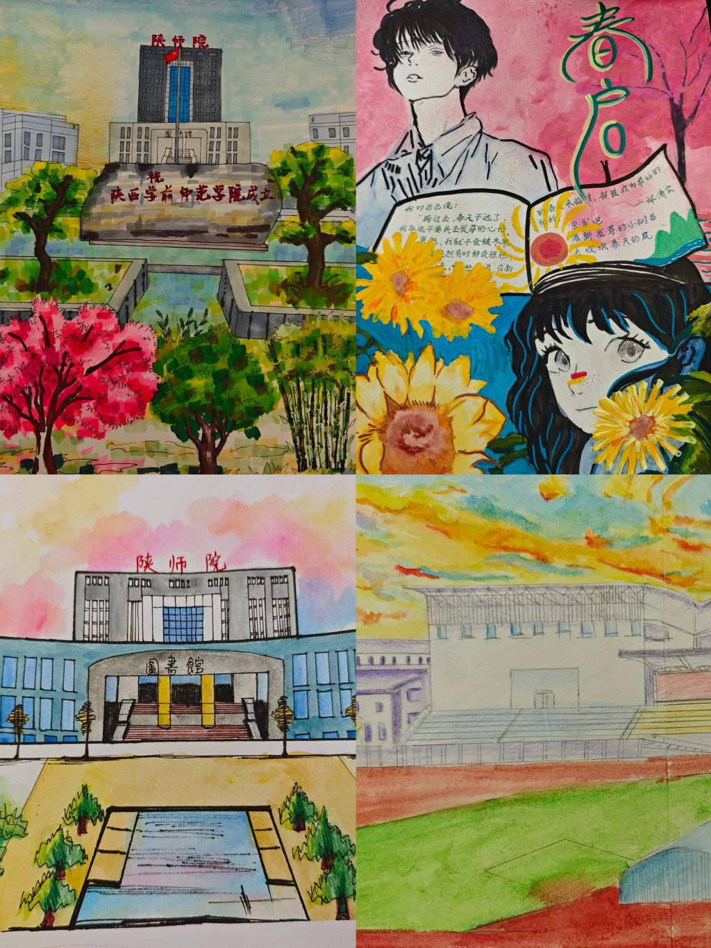 大赛征集的作品中,校园美景遍布,刚盛开的玉兰花、翠色欲滴的风景、夕阳下的教学楼、自律的晨跑者、清扫落叶的保洁员、图书馆中奋斗的身影、最美的青春志愿者……作品以细腻的勾勒、完整的构图、明亮的色彩表达出学生对母校的热爱、对春日的憧憬、对梦想的追逐。做为师院有心人,他们用画笔在陕师院和“春天”完美的约会!