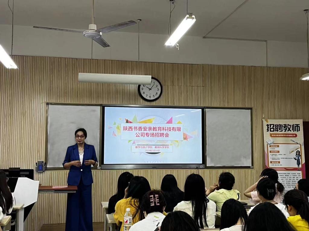 本次招聘会由陕西书香安亲教育科技有限公司负责人张立军老师为学生宣讲。介绍了几家企业概况、主营业务、招聘岗位、岗位条件、薪资待遇等内容,并现场组织学生进行了报名。同时告知学生公司还为员工提供丰富的培训和学习机会,提升应届生的专业技能和综合素质。在场同学积极参与,与用人单位主动沟通,现场气氛热烈。