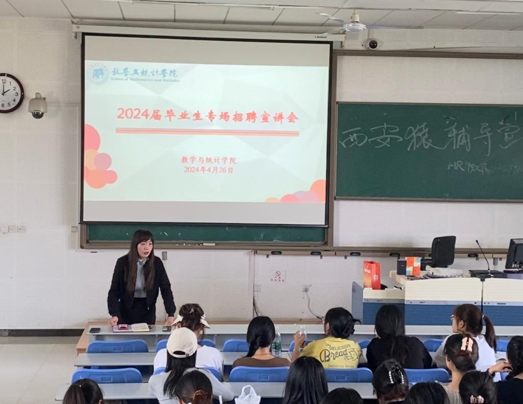 为持续促进2024届毕业生高质量就业工作,扩展就业岗位,4月26日,数学与统计学院在积学楼A3阶梯教室召开了毕业生专场招聘宣讲会。学院特邀西安猿辅导人力资源负责人张裕旺老师为学生宣讲。学院副书记、毕业班辅导员张晔及未落实就业的毕业生参加活动。