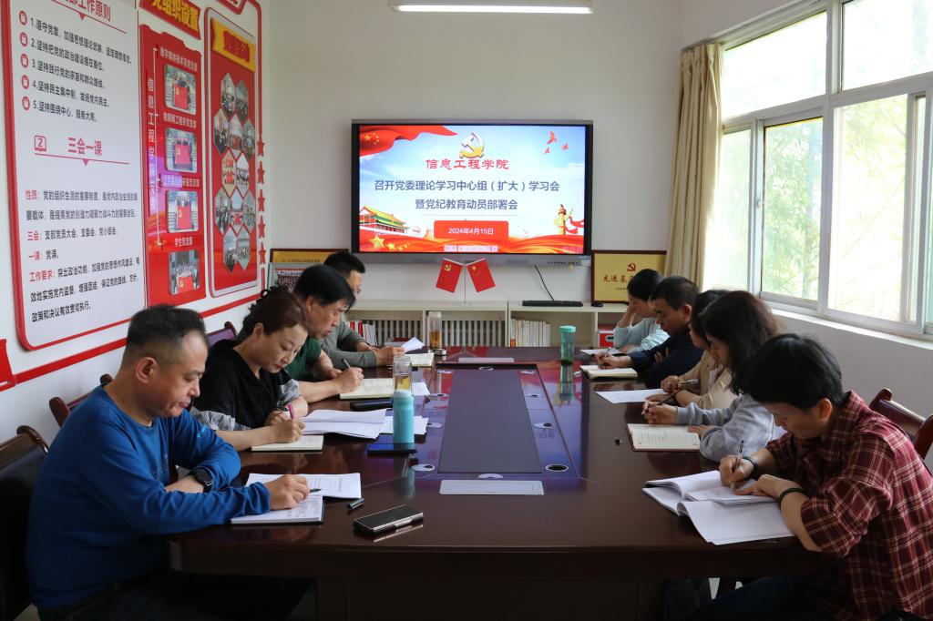 【信息工程学院党委】2024年4月15日下午,信息工程学院在积学楼A202党员工作室召开党委理论学习中心组(扩大)学习会暨党纪教育动员部署会,院领导班子成员、党委委员及支部书记参加,院党委书记主持会议。