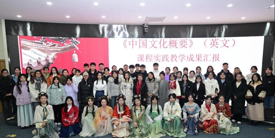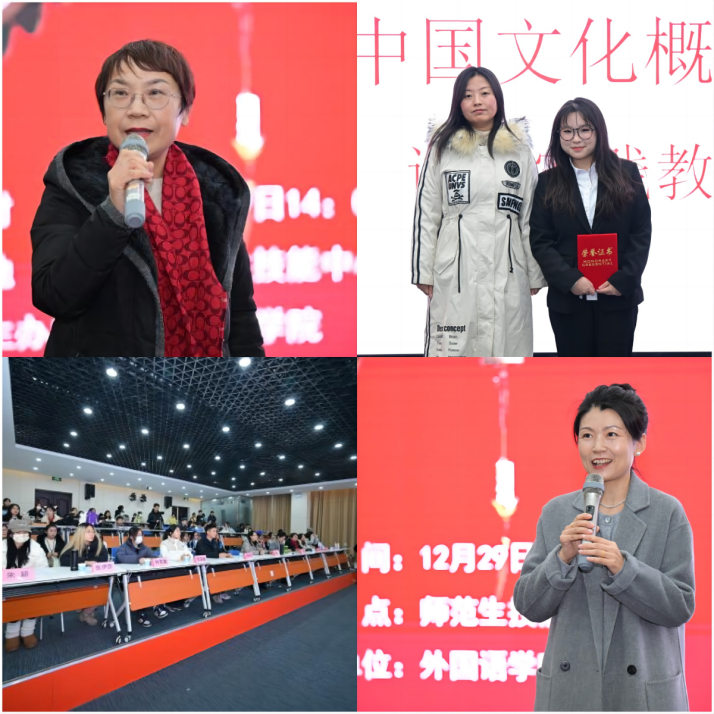 2023年12月29日下午14:00,外国语学院进行了《中国文化概要》(英文)课程实践教学成果汇报展示,活动由承担本门课程的主讲教师张莉娟副教授和高倩老师策划、组织,活动在申搏师范生技能中心举行。外国语学院张慧军院长、高海燕书记、李娟副教授、课程团队成员以及2021级学生参加了此次汇报展示活动。
