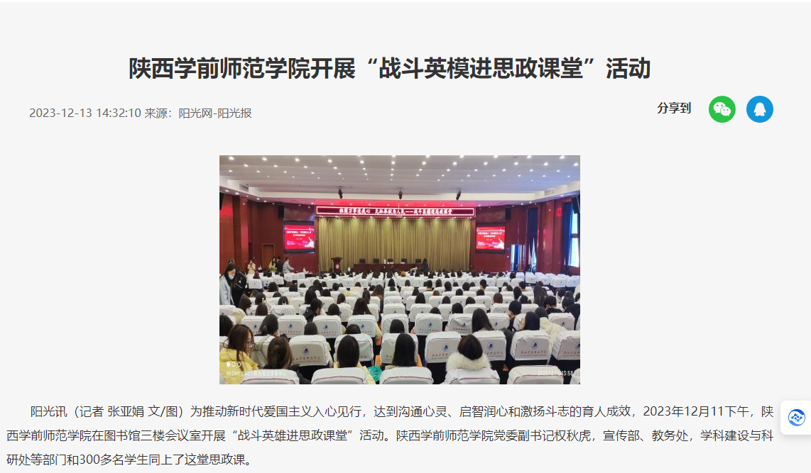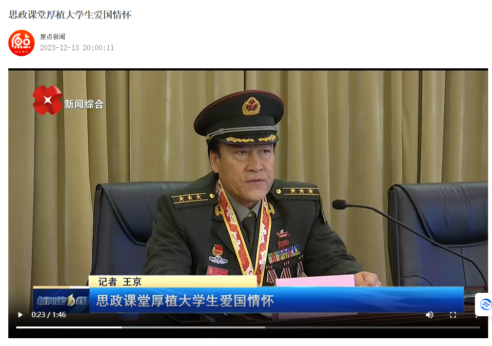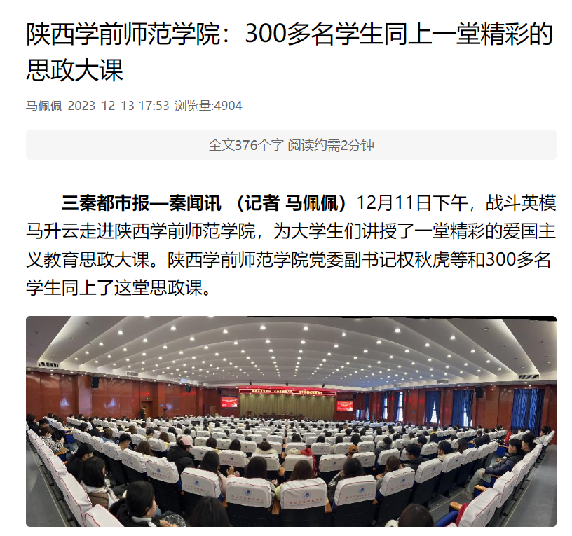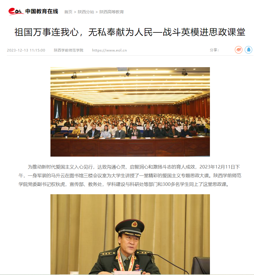 为推动新时代爱国主义入心见行,达致沟通心灵、启智润心和激扬斗志的育人成效,2023年12月11下午,一身军装的马升云同志在申搏图书馆三楼学术报告厅为大学生讲授了一堂精彩的爱国主义专题思政大课。校党委副书记权秋虎、宣传部、教务处、学科建设与科研处等部门负责人和300多名学生同上了这堂思政大课。