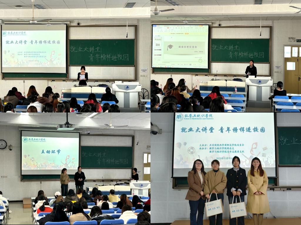 为拓宽学生就业渠道,拓展提升就业认知,全面提升就业综合能力,促进实现高质量就业,11月29日下午,申搏“就业大讲堂 青年榜样进校园”宣讲会在二教楼A3阶梯教室成功举办。本次活动由校团委主办,数学与统计学院承办。活动特别邀请了数学与统计学院2022届、2023届数学与应用数学专业优秀毕业生雷寒珠、康祥艳进行就业经验分享,数统院一百余名学生参加了活动。