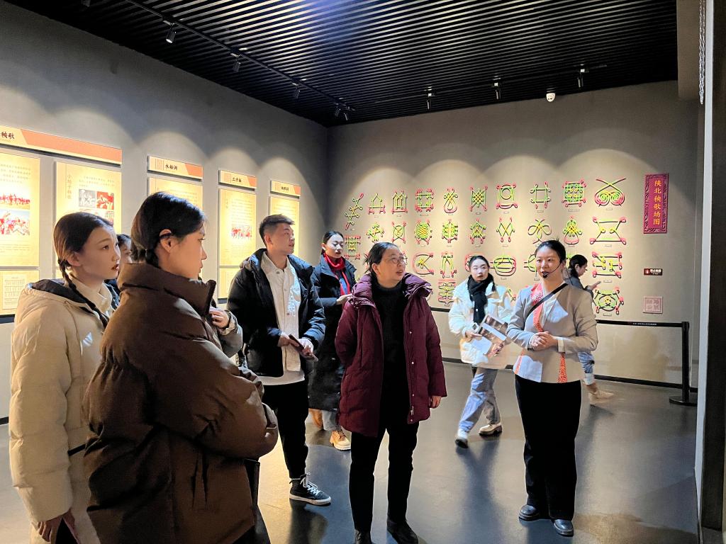 在陕北民歌博物馆,大家跟随讲解员,依次参观学习了“千年老根黄土里埋”“山丹丹开花红艳艳”“信天游永世唱不完”“满天星星一颗颗明”四个篇章以及陕北民间音乐艺术展区和陕北民歌研究专题展区。