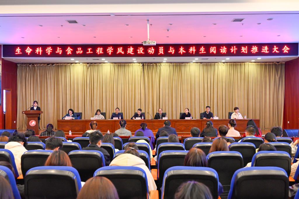 为进一步帮助大学生明确学习目标,激发学生学习动力,培养学生良好学习习惯,涵养学生读书品格,2023年11月8日下午,生命科学与食品工程学院在图书馆报告厅召开学风建设动员与本科生阅读计划推进大会。校党委副书记唐宏、学工部部长薛晓娟、图书馆馆长王俊玉到会指导,学院党政领导、教师代表、辅导员以及生科院全体在校学生共450余人参加了此次大会。大会由副院长王立霞主持。