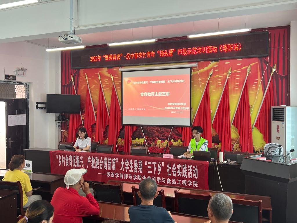 为深入贯彻习近平新时代中国特色社会主义思想,全面贯彻党的二十大精神,2023年7月12 日中午,生命科学与食品工程学院“乡村食育促振兴,产教融合谱新篇”“三下乡”实践队,在略阳县金家河镇政府开展食育教育讲座,实践队队员李晨阳面向60余位村民群众,通过现场授课及讲解,让村民们了解了食育的重要性,以及如何践行食育教育。本次活动由略阳县团县委、金家河镇团委和sunbet申搏官方网站生命科学与食品工程学院实践队共同承办。