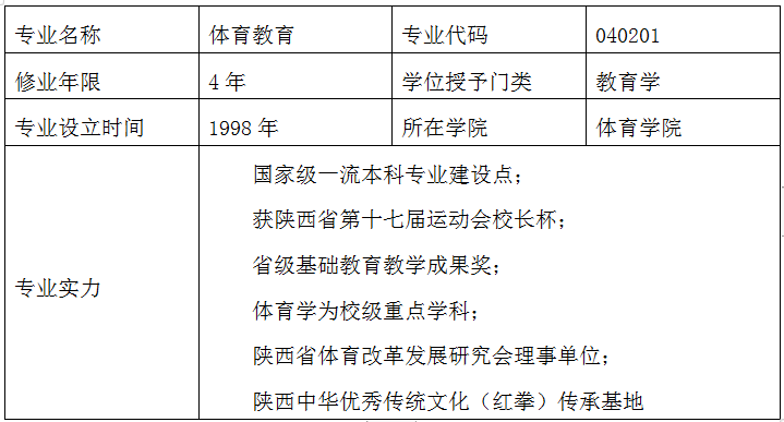 体育教育专业成立于1998年,2002年获准招收体育教育专业专科生;2003年联合西安文理学院,2004年联合陕西理工大学招收体育教育专业本科生;2013年获准独立招收体育教育专业本科生;2017年获批教育学学士学位授予权。